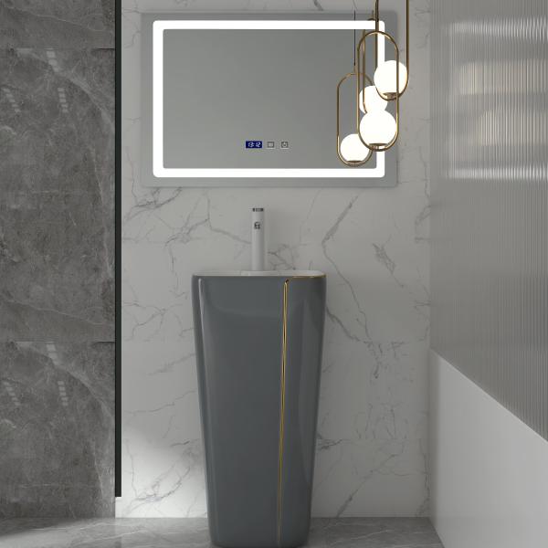 Hotel Luxury Pedestal Free Standing Sink Round Ceramic Bathroom Gray Gold Pedestal Wash Hand Basin